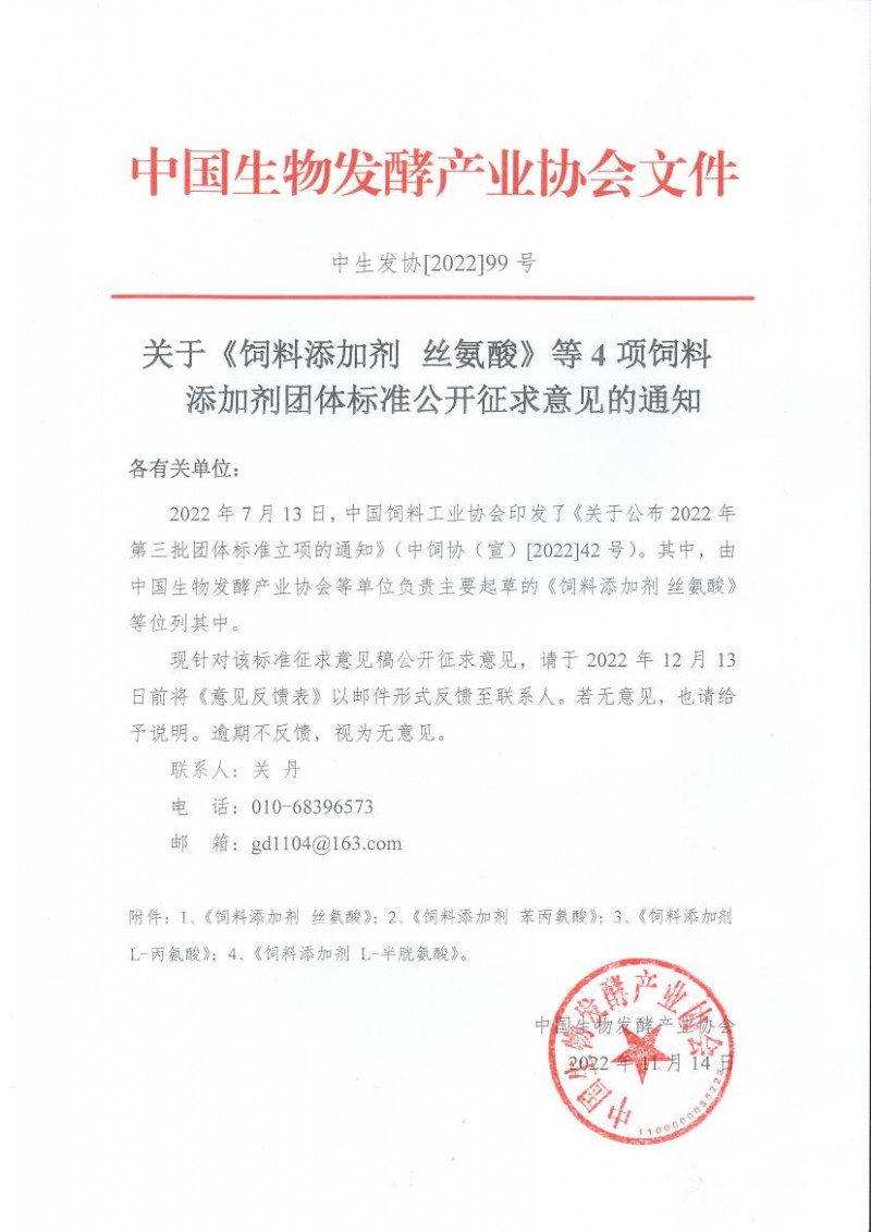中國(guó)生物發(fā)酵產(chǎn)業(yè)協(xié)會(huì)關(guān)于《飼料添加劑 L-絲氨酸》等4項(xiàng)飼料添加劑團(tuán)體標(biāo)準(zhǔn)公開征求意見的通知(中生發(fā)協(xié)[2022]99號(hào))