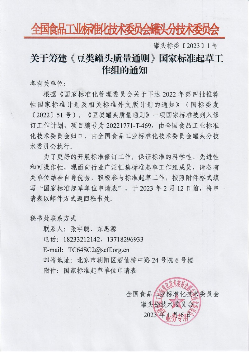 核心提示:全國食品工業(yè)標(biāo)準(zhǔn)化技術(shù)委員會罐頭分技術(shù)委員會關(guān)于籌建《豆類罐頭質(zhì)量通則》國家標(biāo)準(zhǔn)起草工作組的通知,截止時間2023-02-12.