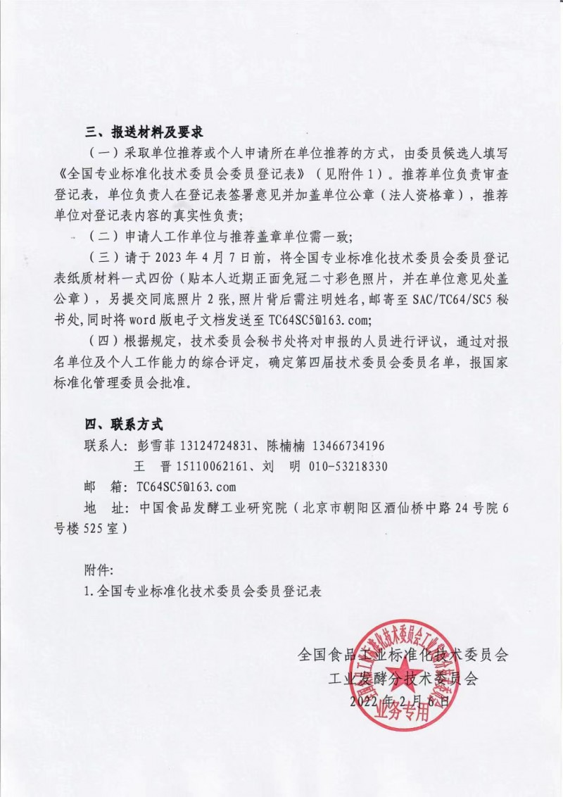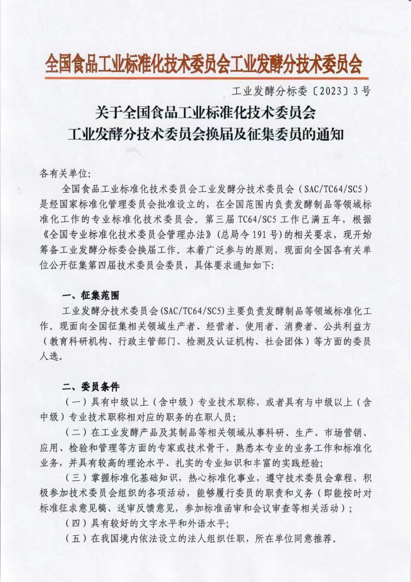 全國食品工業標準化技術委員會工業發酵分技術委員會關于全國食品工業標準化技術委員會工業發酵分技術委員會換屆及征集委員的通知
