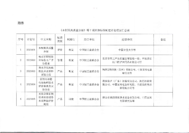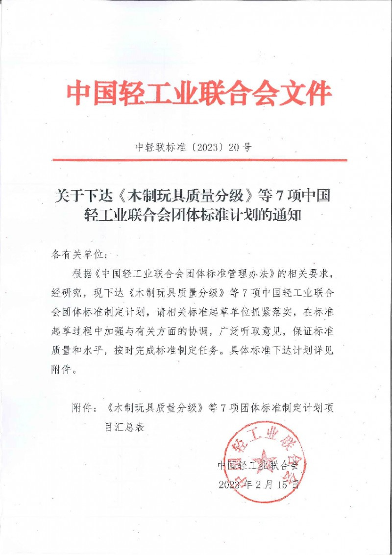 中國輕工業聯合會關于下達《木制玩具質量分級》等7項中國輕工業聯合會團體標準計劃的通知(中輕聯標準[2023]20號)