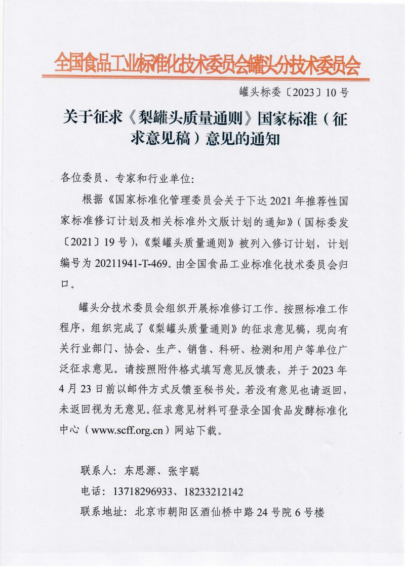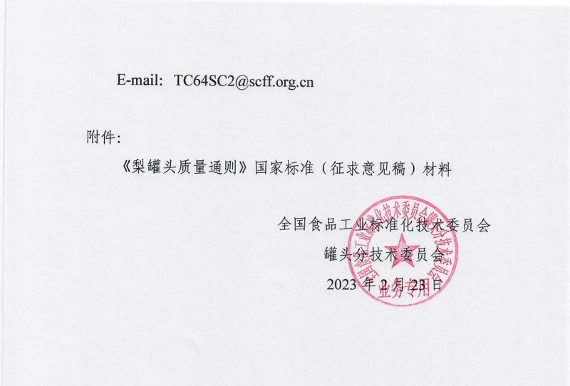 核心提示:全國食品工業(yè)標準化技術委員會罐頭分技術委員會關于征求《梨罐頭質量通則》國家標準(征求意見稿)意見的通知,截止時間2023年4月23日。