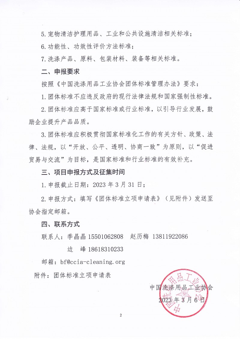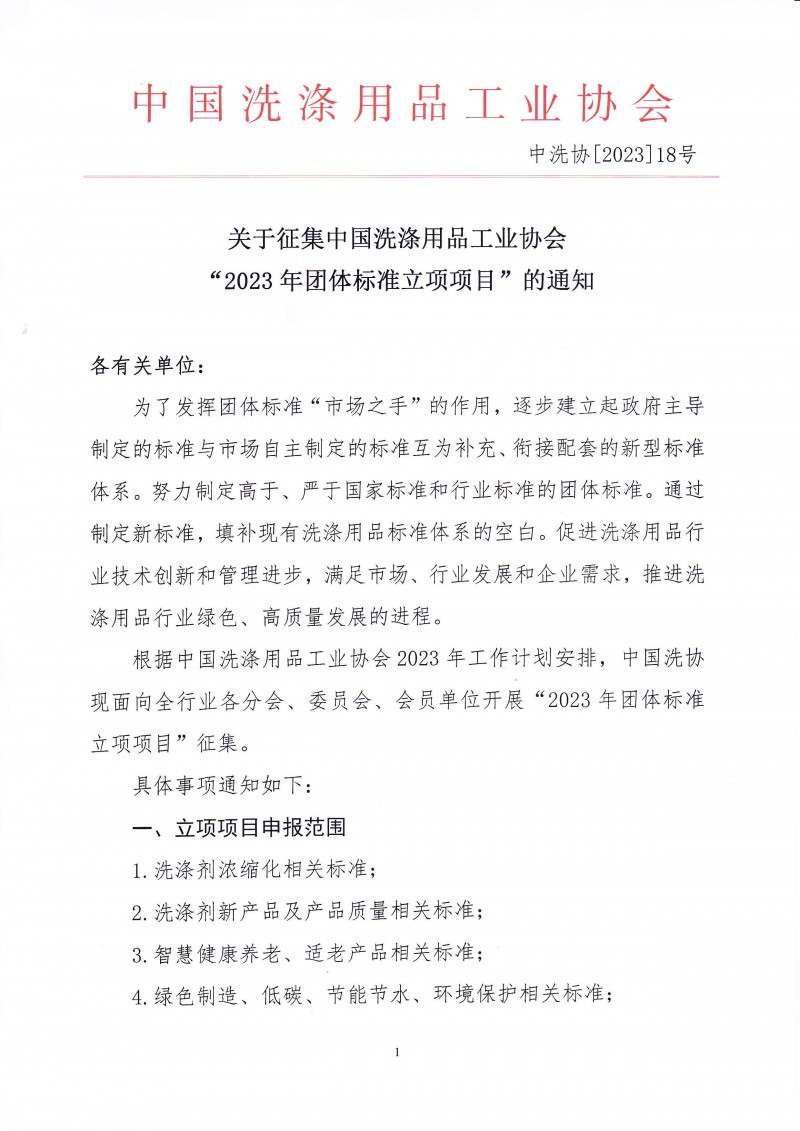 關于征集中國洗滌用品工業協會“2023年團體標準立項項目”的通知(中洗協[2023]18號)