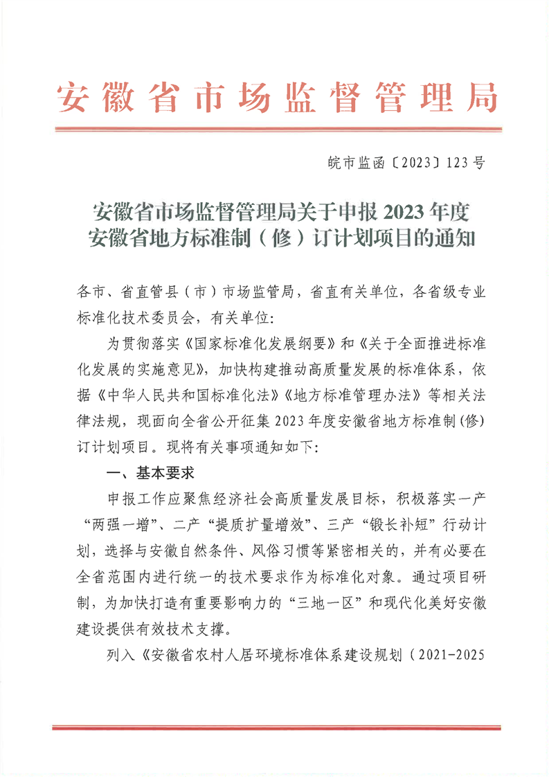 下載中心首頁 » 動態(tài)公告 » 標準動態(tài) » 安徽省市場監(jiān)督管理局關(guān)于申報2023年度安徽省地方標準制(修)訂計劃項目的通知(皖市監(jiān)函[2023]123號)