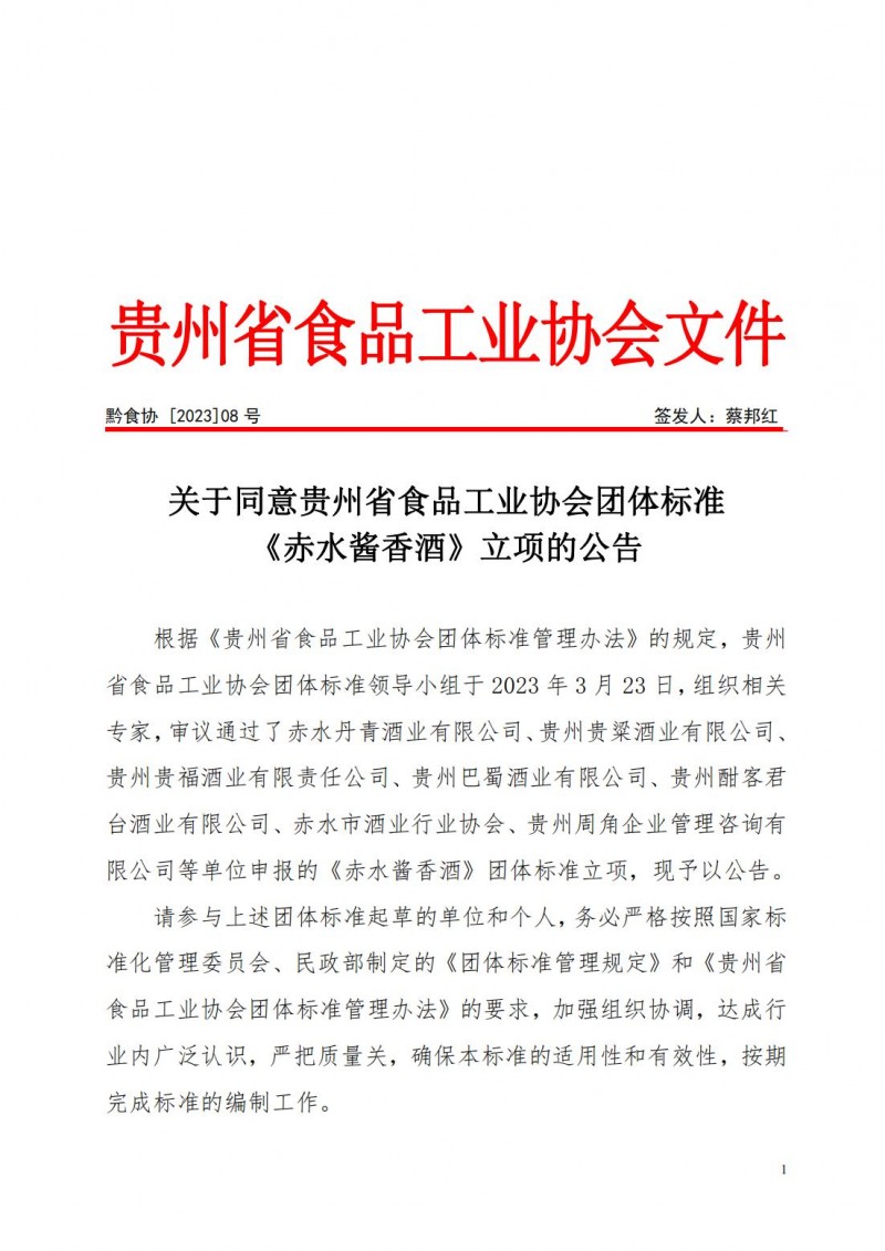 關于同意貴州省食品工業協會團體標準 《赤水醬香酒》立項的公告(黔食協[2023]08號)