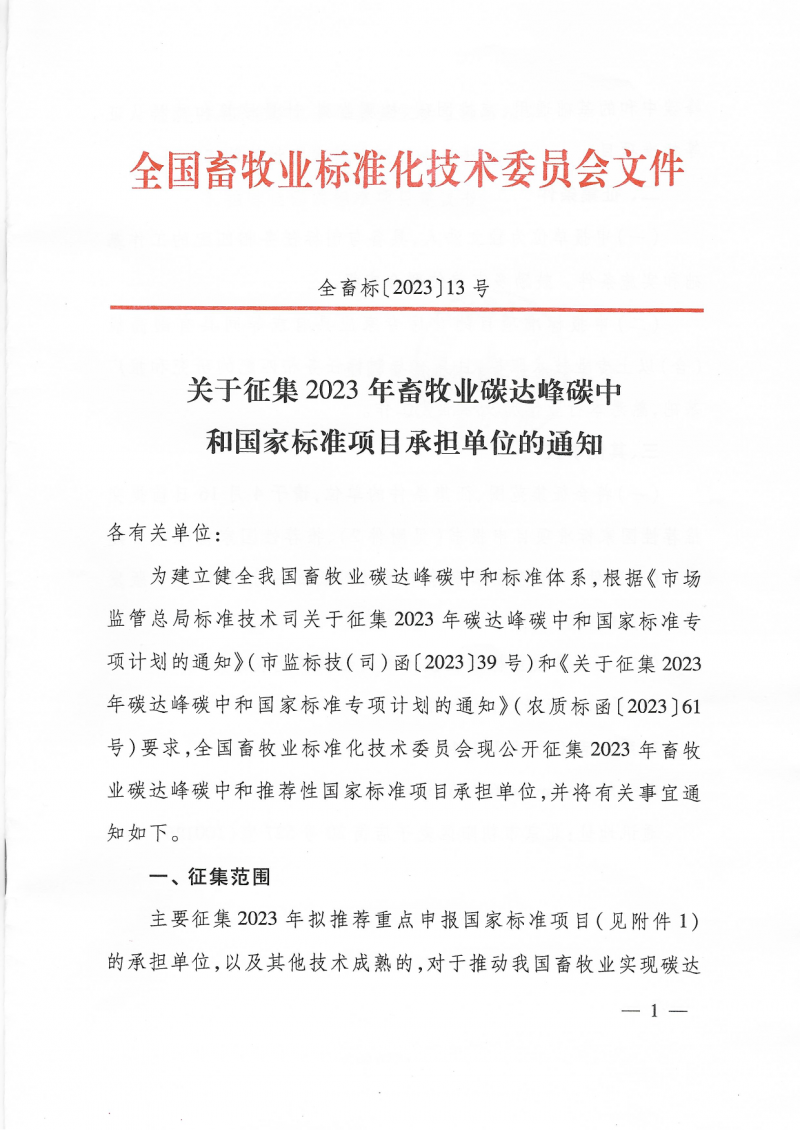 全國畜牧業標準化技術委員會關于征集2023年畜牧業碳達峰碳中和標準項目承擔單位的通知