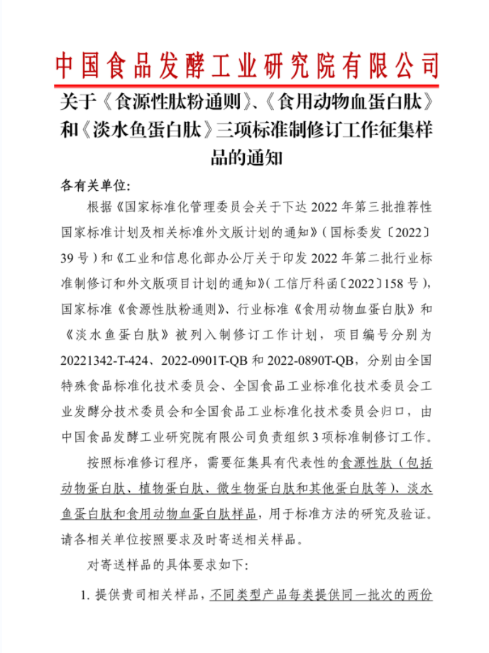 中國食品發(fā)酵工業(yè)研究院有限公司關(guān)于《食源性肽粉通則》、《食用動物血蛋白肽》和《淡水魚蛋白肽》三項標(biāo)準(zhǔn)制修訂工作征集樣品的通知