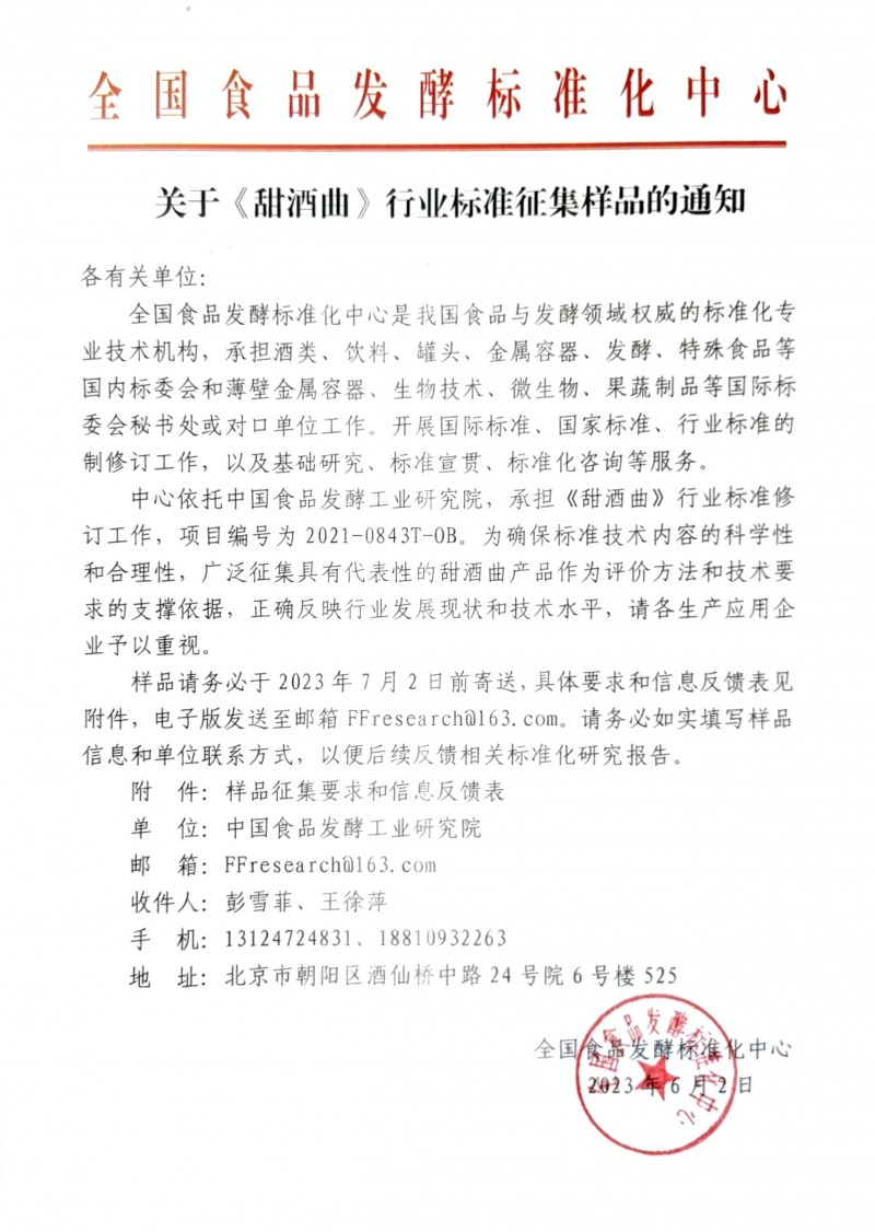 核心提示:全國食品發酵標準化中心關于《甜酒曲》行業標準征集樣品的通知,截止時間2023.7.2。