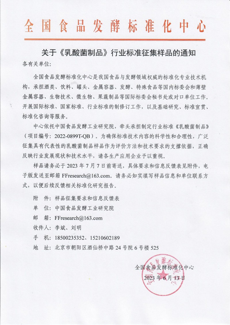 全國食品發酵標準化中心關于《乳酸菌制品》行業標準征集樣品的通知