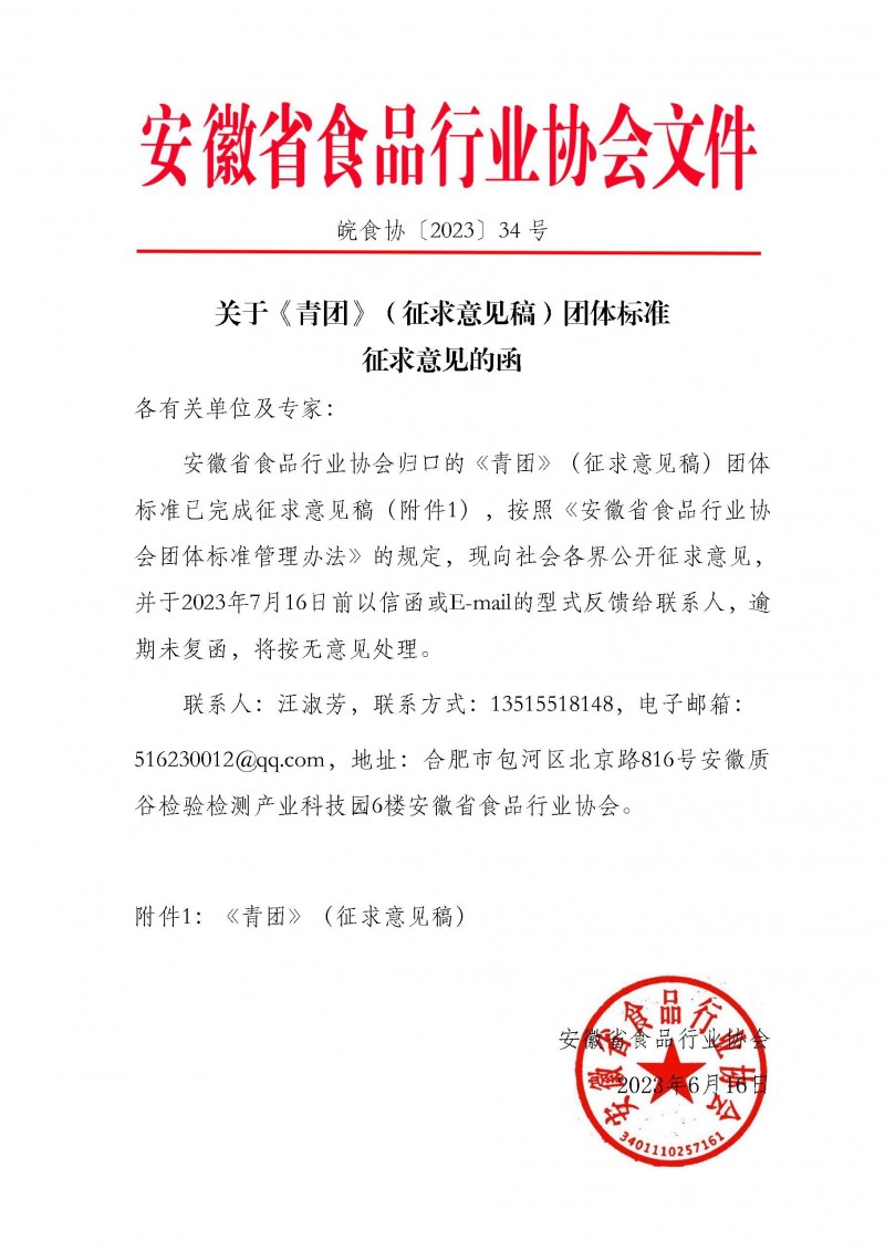 安徽省食品行業(yè)協(xié)會(huì)關(guān)于《青團(tuán)》(征求意見稿)團(tuán)體標(biāo)準(zhǔn) 征求意見的函(皖食協(xié)[2023]34號(hào))