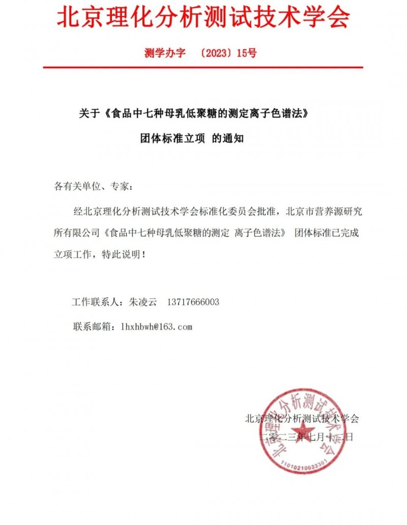 北京理化分析測(cè)試技術(shù)學(xué)會(huì)關(guān)于《食品中七種母乳低聚糖的測(cè)定 離子色譜法》團(tuán)體標(biāo)準(zhǔn)的立項(xiàng)通知(測(cè)學(xué)辦字(2023)15號(hào))