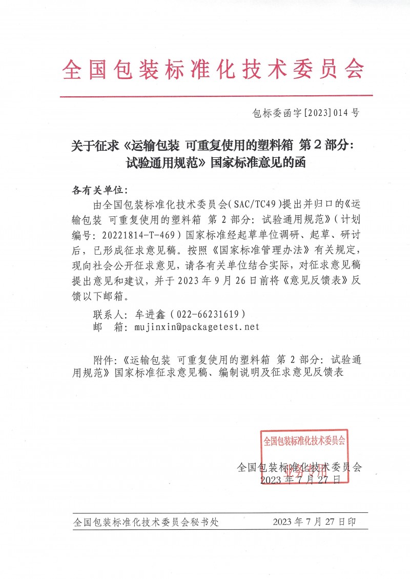 核心提示:全國包裝標(biāo)準(zhǔn)化技術(shù)委員會(huì)關(guān)于征求《運(yùn)輸包裝 可重復(fù)使用的塑料箱 第2部分:試驗(yàn)通用規(guī)范》國家標(biāo)準(zhǔn)意見的函,截止時(shí)間2023.9.26