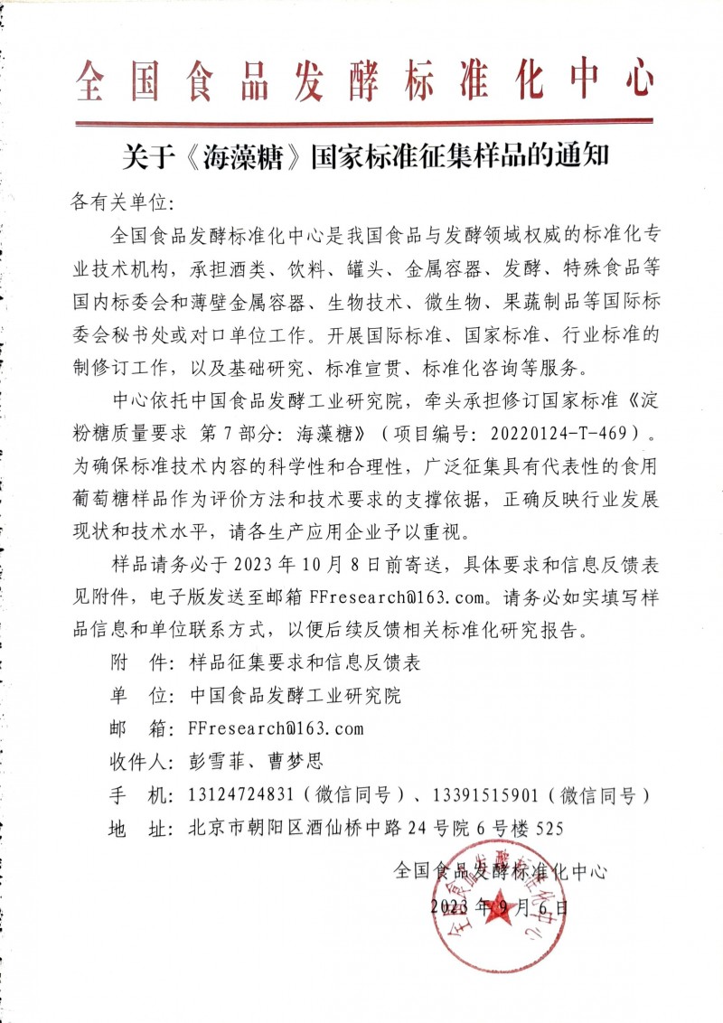 全國(guó)食品工業(yè)標(biāo)準(zhǔn)化技術(shù)委員會(huì)關(guān)于《海藻糖》國(guó)家標(biāo)準(zhǔn)征集樣品的通知