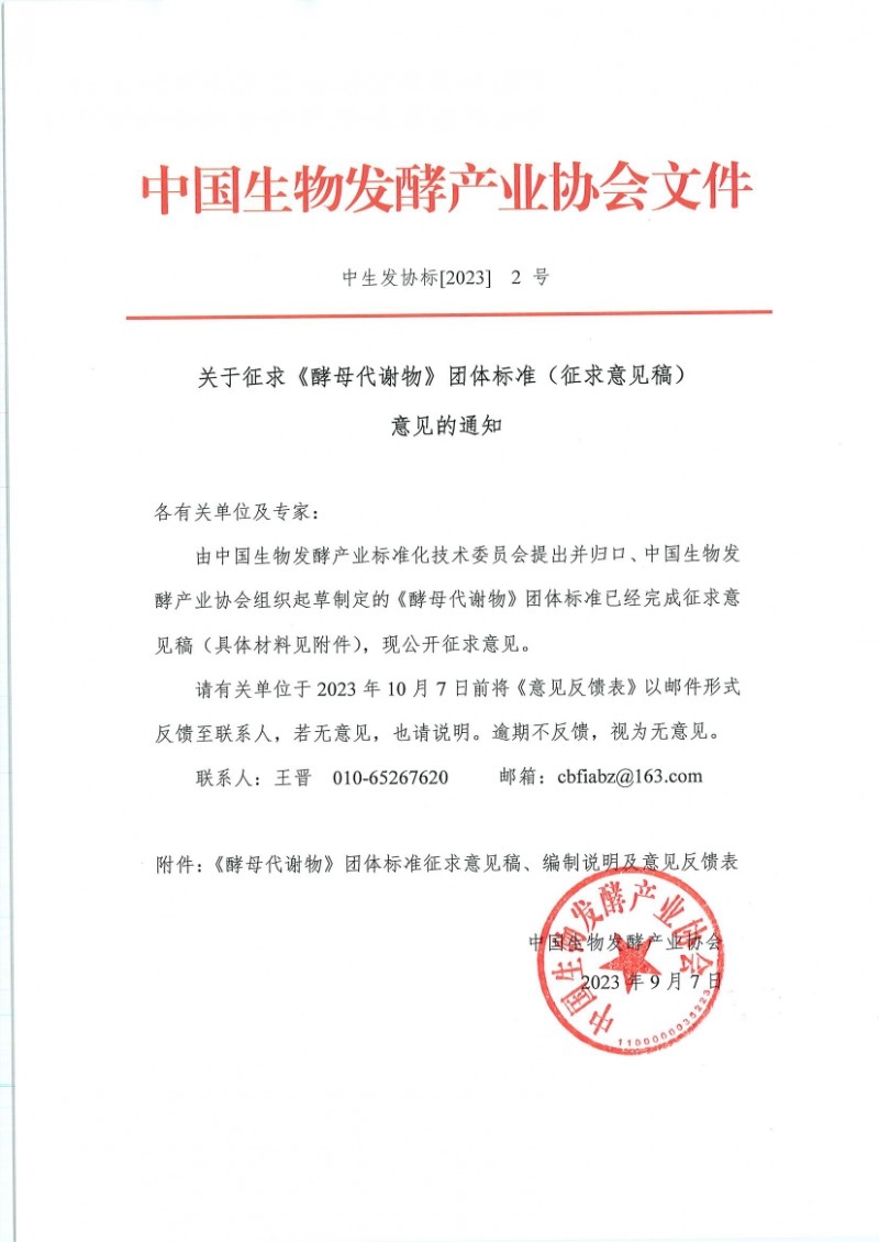中國生物發酵產業協會關于征求《酵母代謝物》團體標準(征求意見稿)意見的通知(中生發協標[2023]2號)