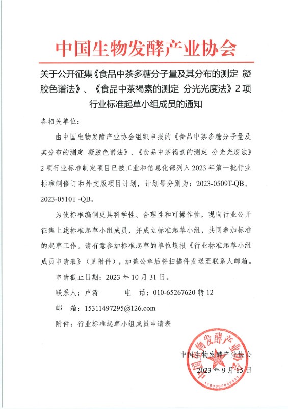 中國(guó)生物發(fā)酵產(chǎn)業(yè)協(xié)會(huì)關(guān)于公開(kāi)征集《食品中茶多糖分子量及其分布的測(cè)定 凝膠色譜法》2項(xiàng)行業(yè)標(biāo)準(zhǔn)起草小組成員的通知