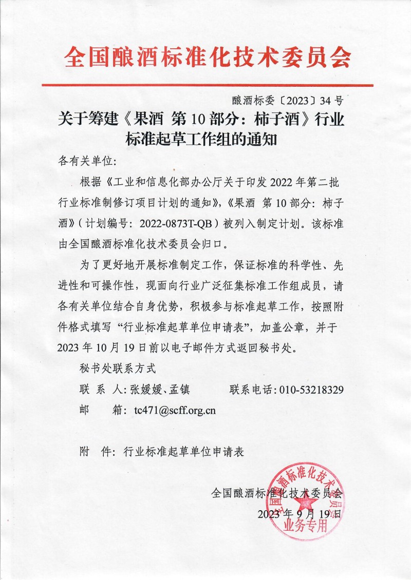 全國釀酒標準化技術委員會關于籌建《果酒 第10部分:柿子酒》行業標準起草工作組的通知(釀酒標委[2023]34號)