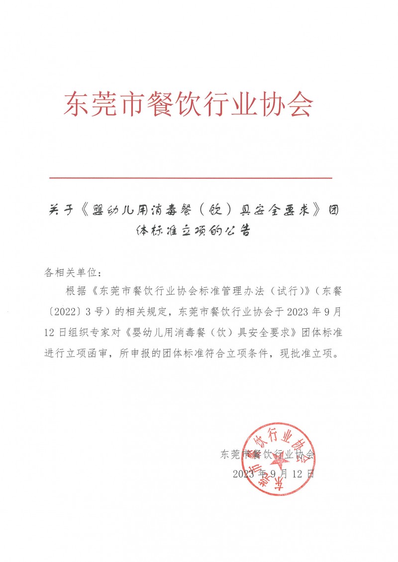 東莞市餐飲行業協會關于《嬰幼兒用消毒餐(飲)具安全要求》團體標準立項的公告