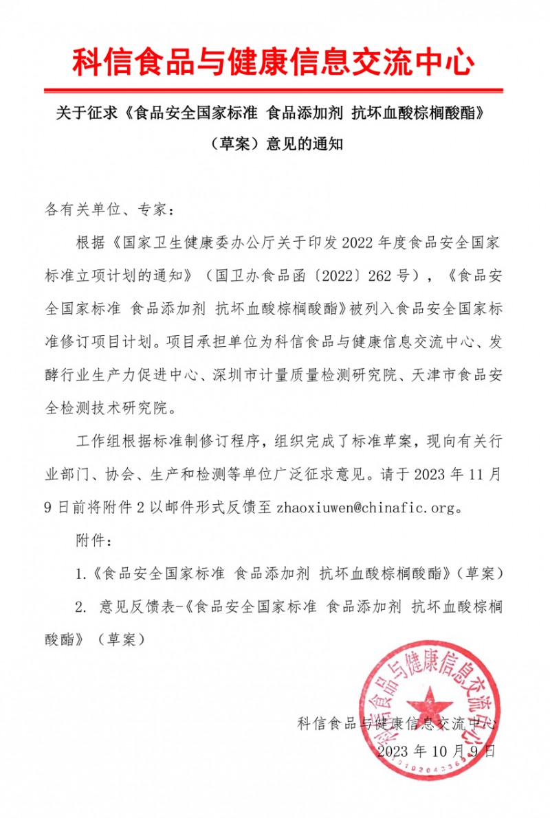 核心提示:科信食品與健康信息交流中心關于征求《食品安全國家標準 食品添加劑抗壞血酸棕櫚酸酯》(草案)意見的通知,截止時間2023.11.9