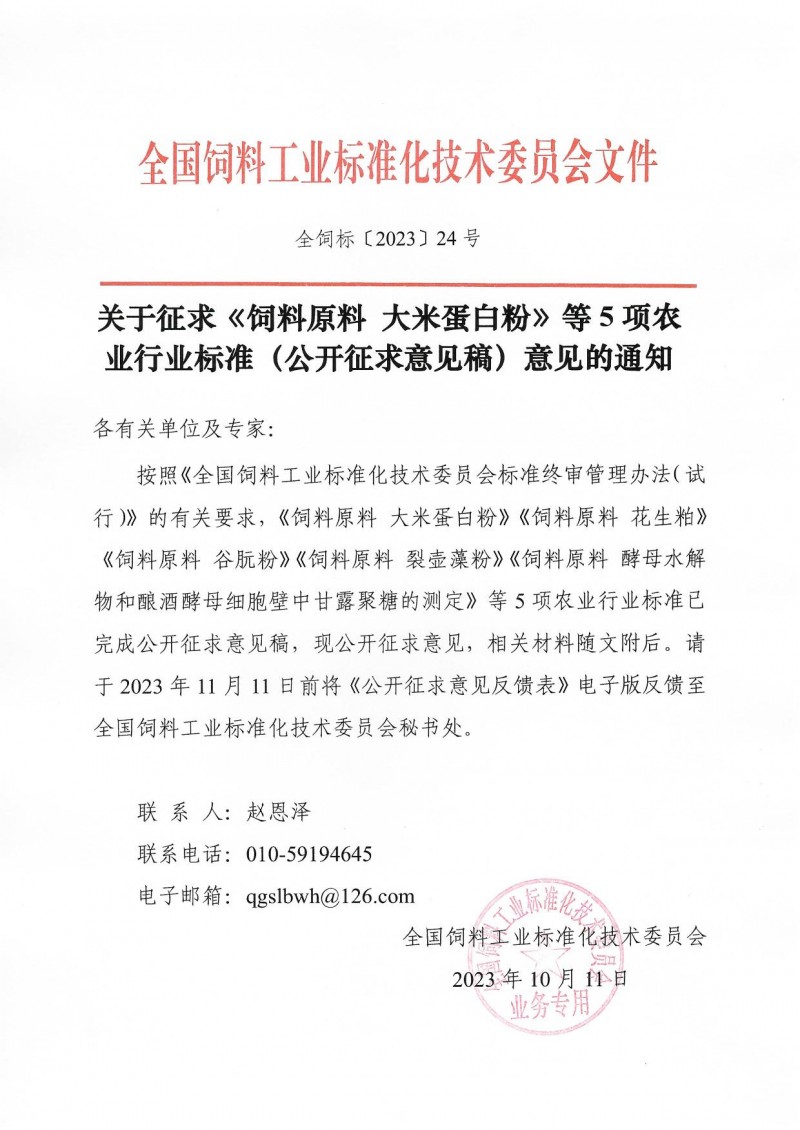 1.關于征求《飼料原料 大米蛋白粉》等5項農業行業標準(公開征求意見稿)意見的通知.pdf