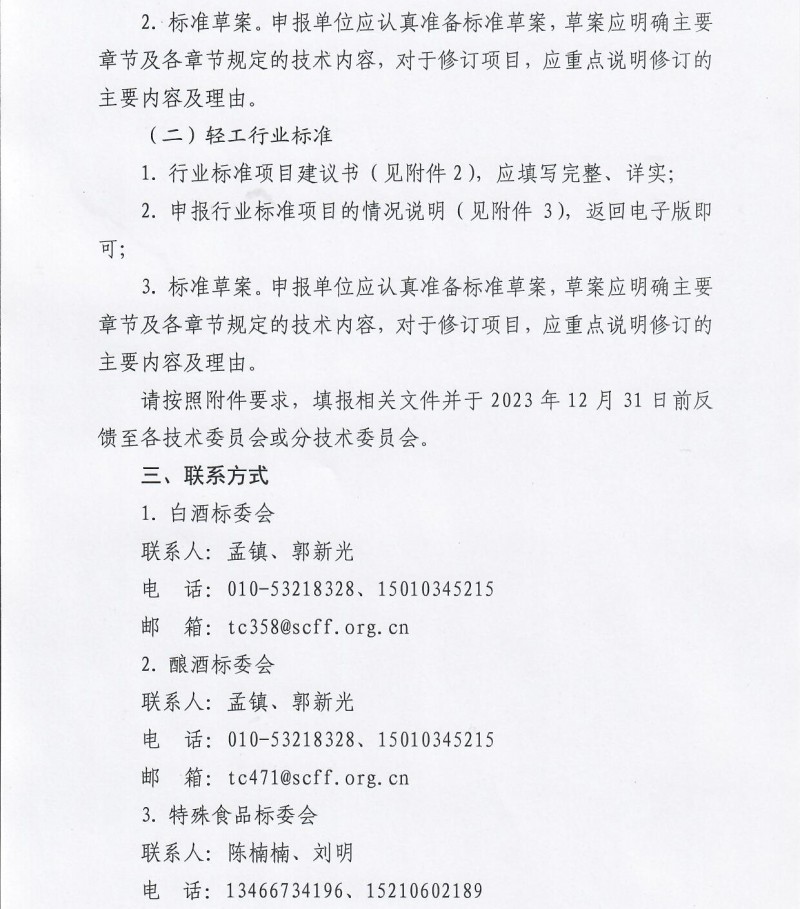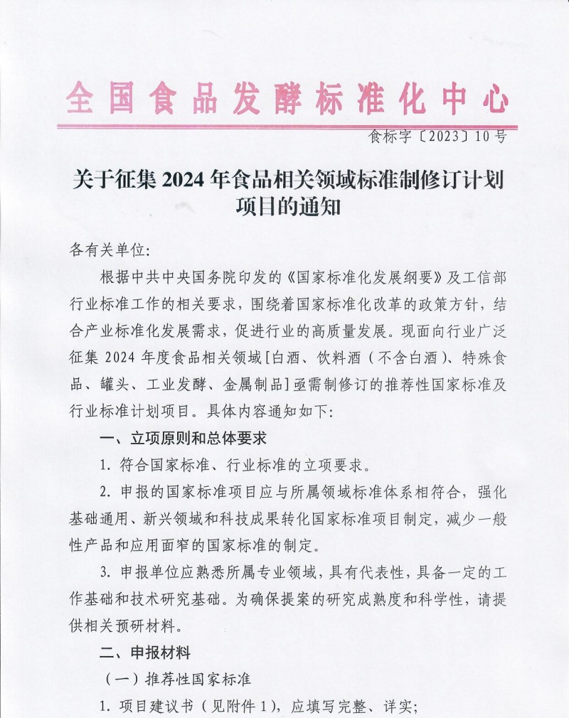 全國食品發酵標準化中心關于征集2024年食品相關領域標準制修訂計劃項目的通知