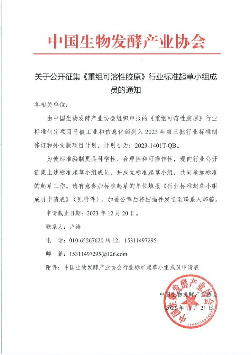 中國生物發酵產業協會關于公開征集《重組可溶性膠原》行業標準起草小組成員的通知