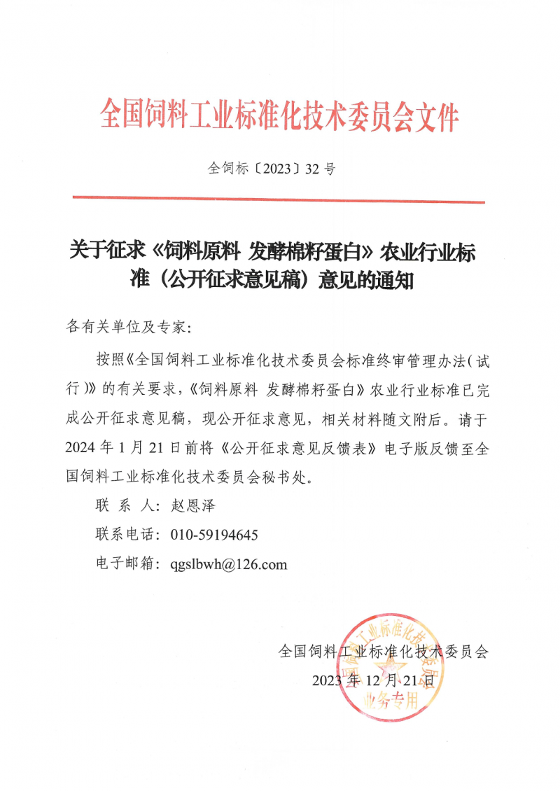 核心提示:全國飼料工業標準化技術委員會關于征求《飼料原料 發酵棉籽蛋白》農業行業標準(公開征求意見稿)意見的通知,截止時間2024.1.21.