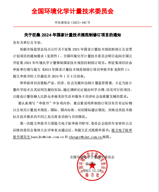 全國環境化學計量技術委員會關于征集2024年國家計量技術規范制修訂項目的通知
