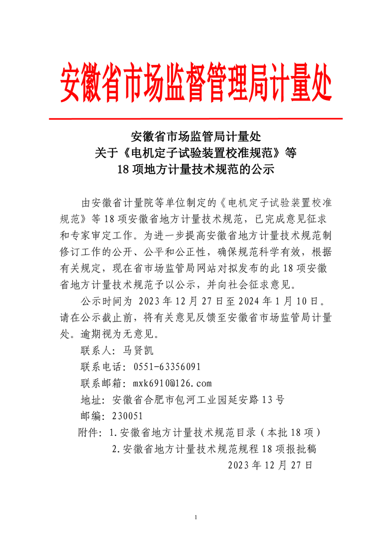 核心提示:由安徽省計量院等單位制定的《大米全景品質分析儀 校準規范》等18項安徽省地方計量技術規范,已完成意見征求和專家審定工作,根據有關規定,現在省市場監管局網站對擬發布的此18項安徽省地方計量技術規范予以公示,并向社會征求意見,公示時間為2023年12月27日至2024年1月10 日。