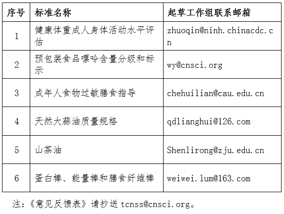 由中國營養學會立項的《健康體重成人身體活動水平評估》《預包裝食品嘌呤含量分級和標示》等6項團體標準已完成征求意見稿,現公開征求意見。請有關單位及專家提出意見或建議,填寫《征求意見反饋表》,并于2024年2月8日前以郵件形式反饋至各標準工作組,并抄送團體標準工作秘書處tcnss@cnsci.org郵箱,逾期未回復按無意見處理。