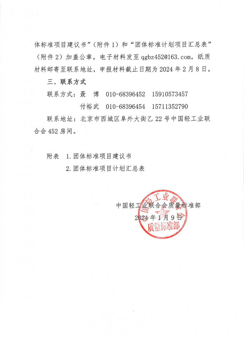 關于征集2024年中國輕工業聯合會團體標準計劃項目的通知(中輕聯標準發[2024]13號)