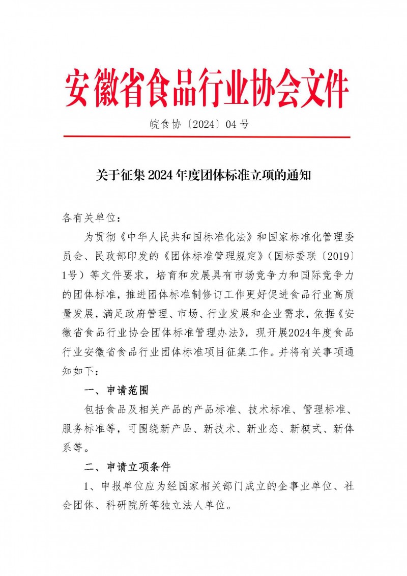 安徽省食品行業協會關于征集2024年度團體標準立項的通知(皖食協〔2024〕04號)
