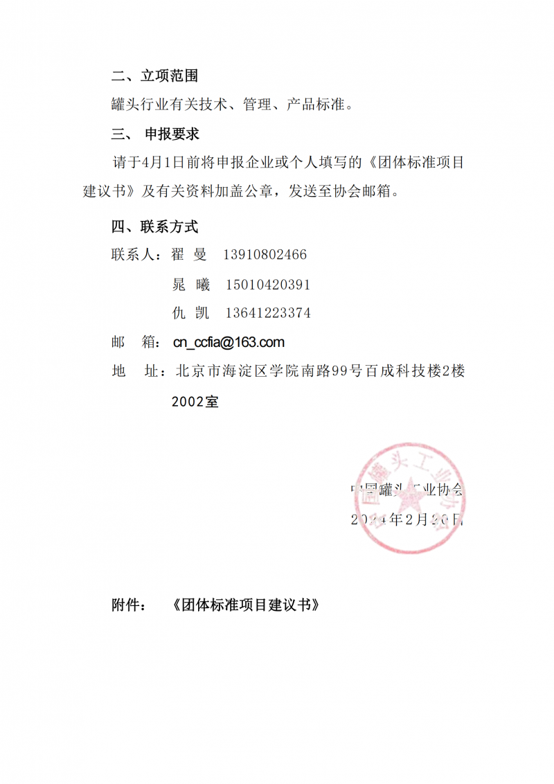 關于公開征集2024年度中國罐頭工業協會團體標準立項建議的通知(中罐協[2024]06號)