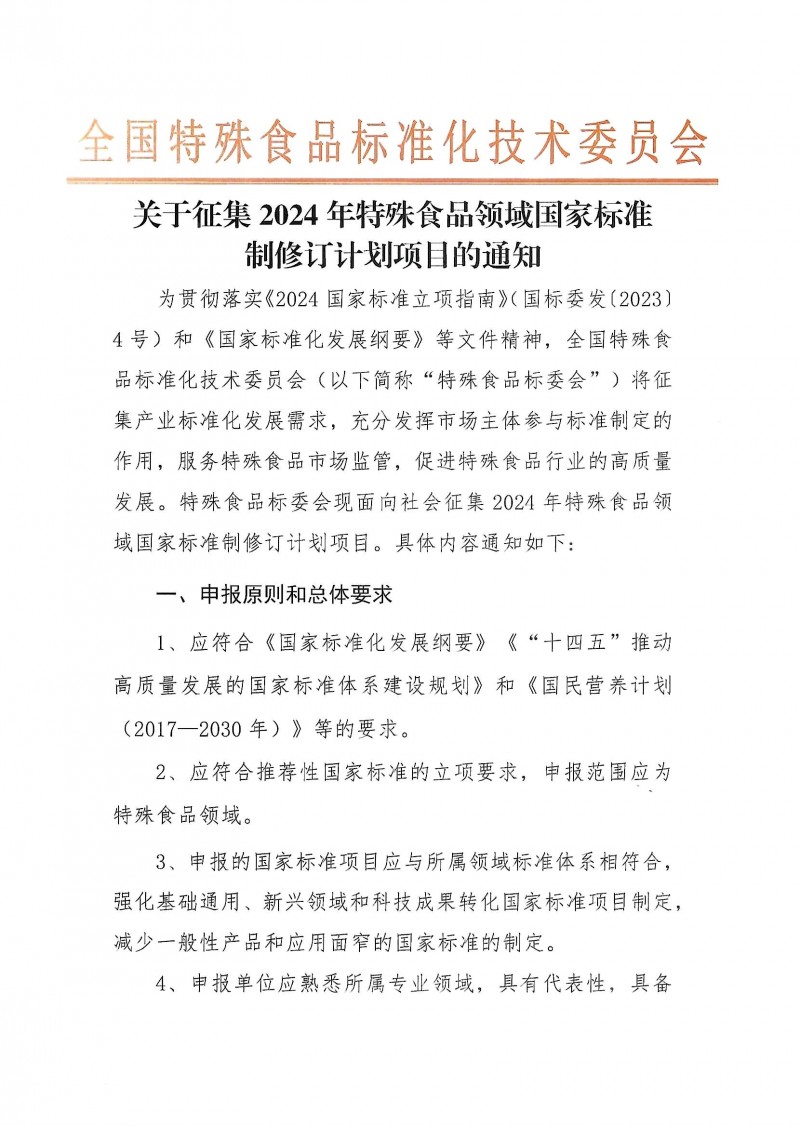 全國特殊食品標準化技術(shù)委員會關(guān)于征集2024年特殊食品領(lǐng)域國家標準制修訂計劃項目的通知