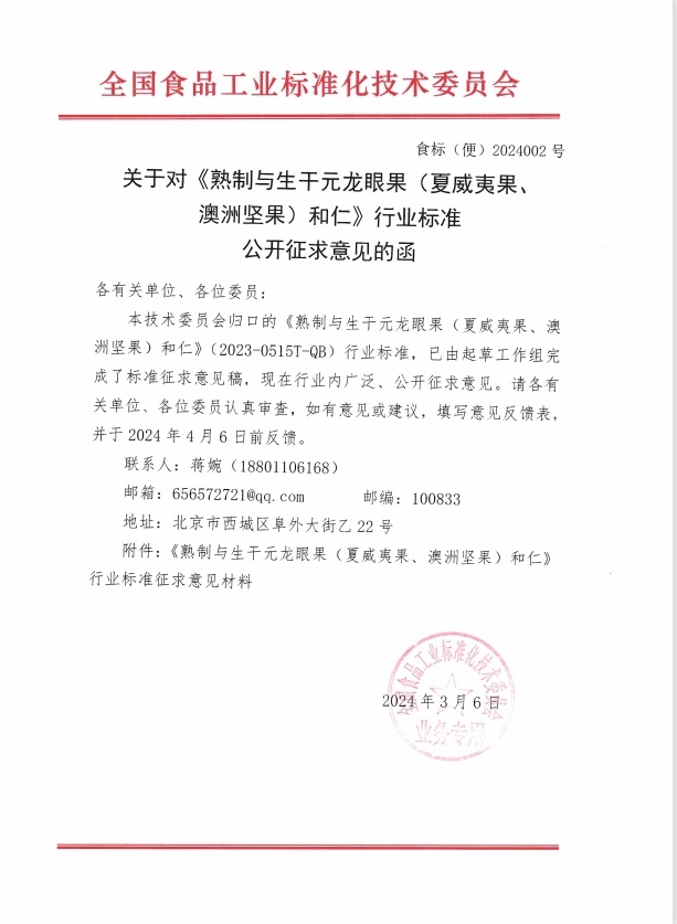 《熟制與生干元龍眼果(澳洲堅果、夏威夷果)和仁》全國行業標準,全國食品標委會已公開征求意見。為了企業及行業的權益與發展,請珍惜此標準制訂的話語權,積極負責地提出意見。務請于2024年4月6日前將意見發至協會郵箱:cnfiec@csnc.cn。