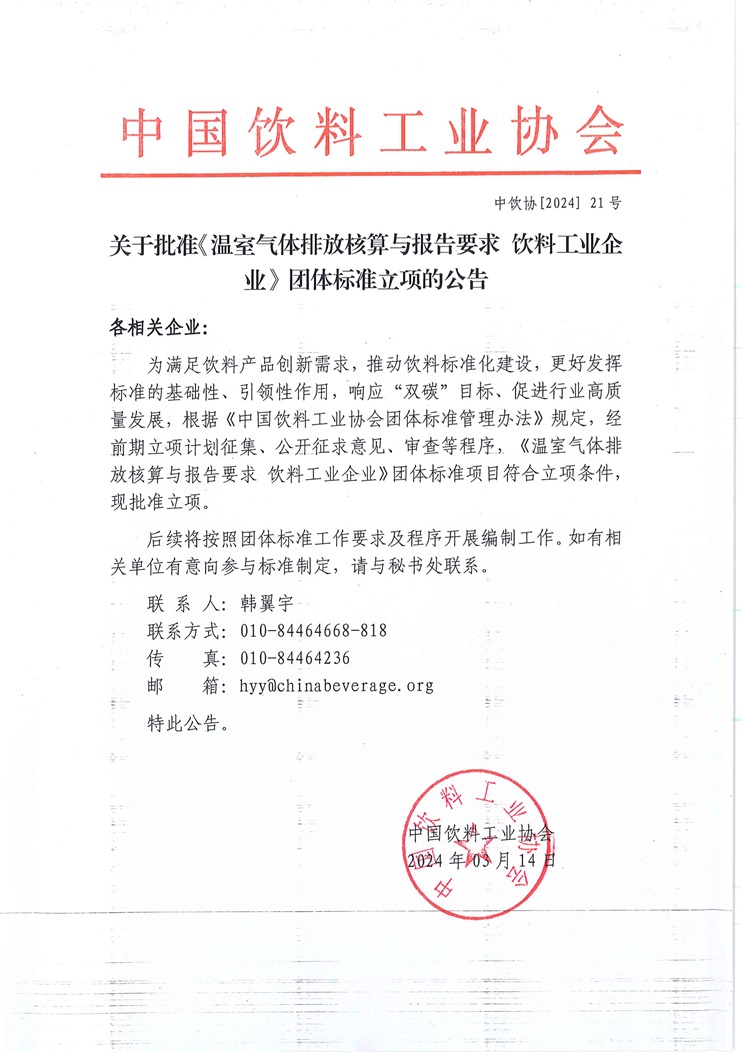 中國飲料工業協會關于批準《溫室氣體排放核算與報告要求 飲料工業企業》團體標準立項的公告(中飲協[2024]21號)