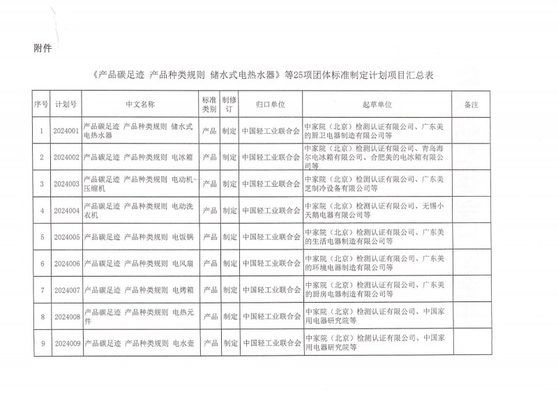 中國輕工業聯合會關于下達《產品碳足跡 產品種類規則 儲水式電熱水器》等25項團體標準計劃的通知(中輕聯標準[2024]43號)
