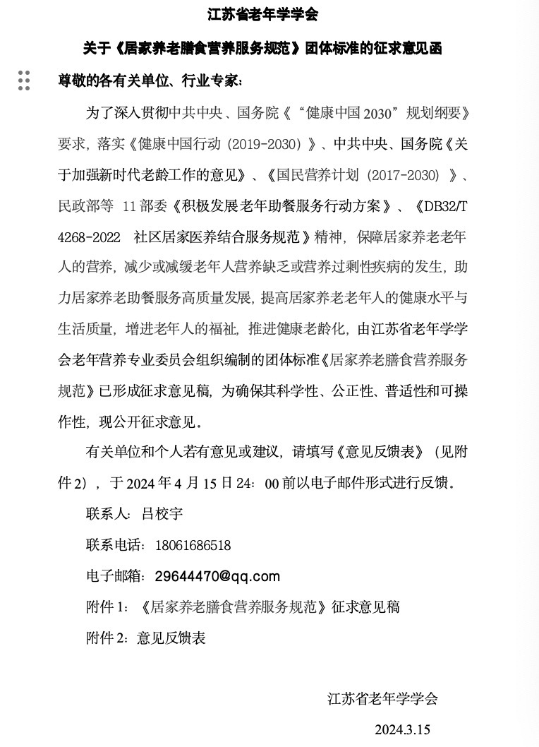 江蘇省老年學學會關于《居家養老膳食營養服務規范》團體標準的征求意見函