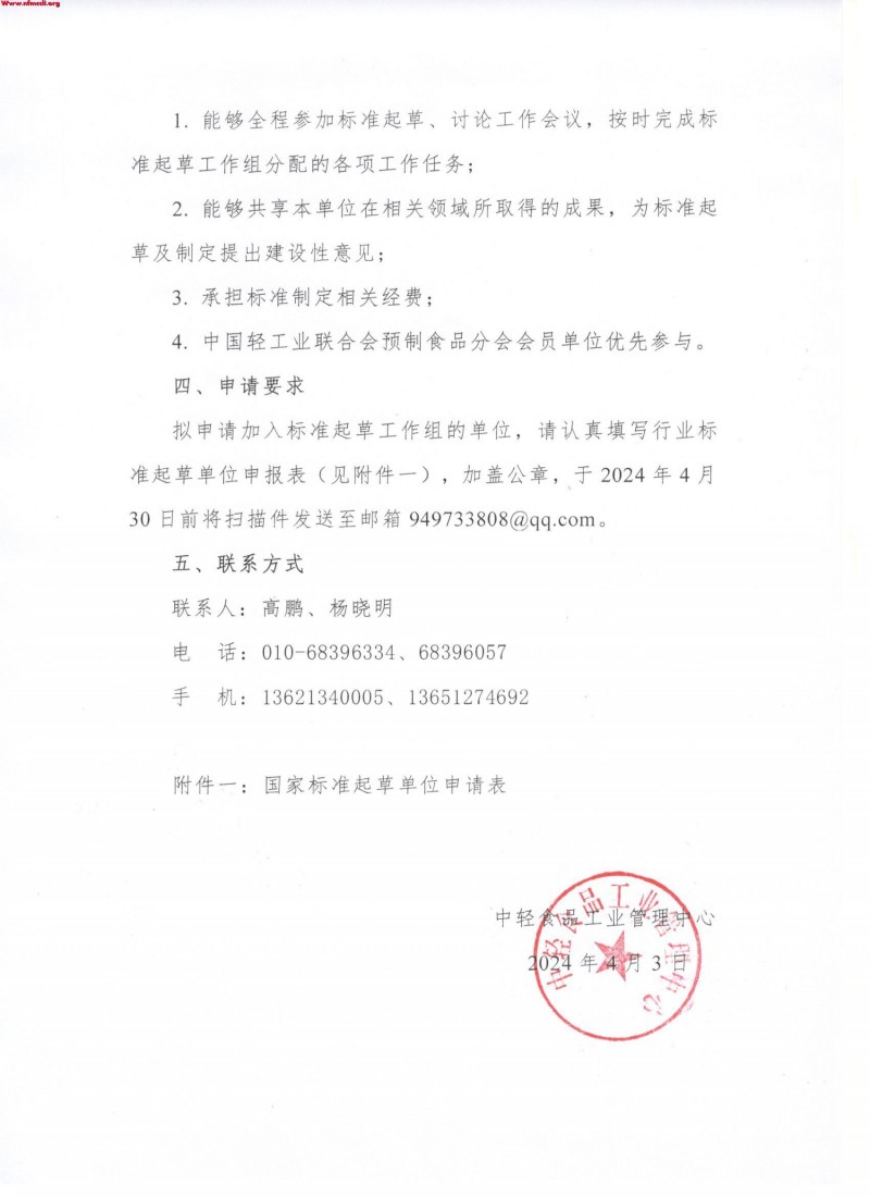中輕食品工業管理中心關于征集推薦性國家標準《預制菜術語和分類》起草單位(中輕食〔2024〕4號)