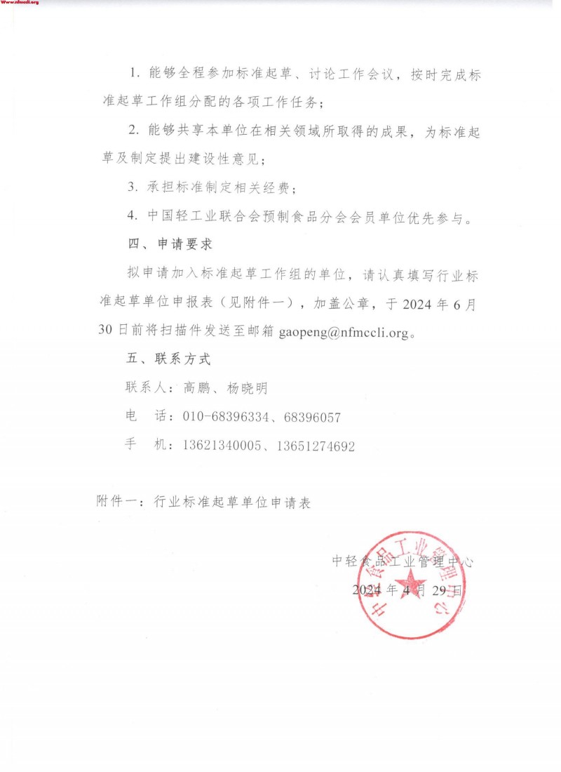 核心提示:根據《工業和信息化部辦公廳關于印發2024年第一批行業標準的通知》要求,為順利完成《方便菜肴》行業標準的修定工作,中輕食品工業管理中心現開展征集標準起草單位的工作,征求時間截止到2024年6月30日。