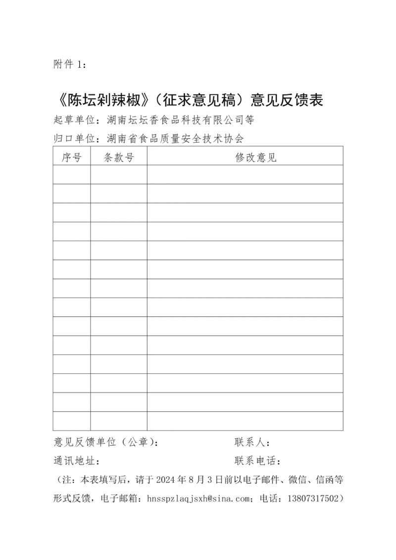 湖南省食品質量安全技術協會關于征求團體標準《陳壇剁辣椒》(征求意見稿)意見的函