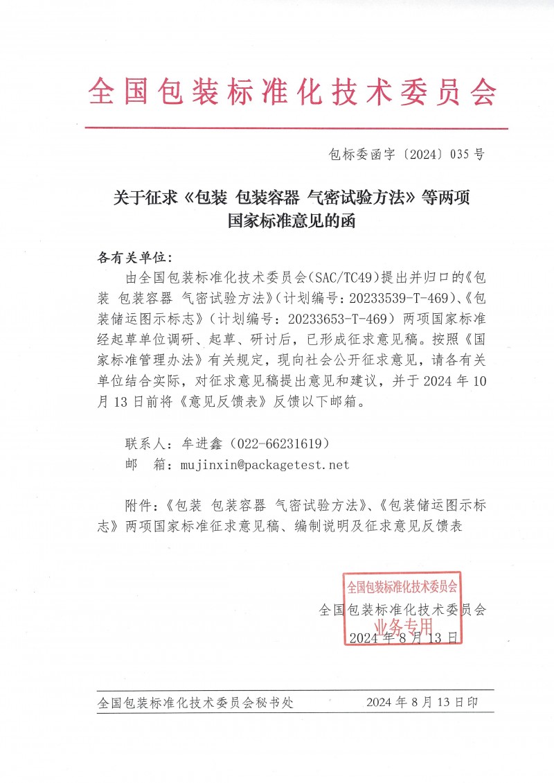 下載中心首頁 » 動態公告 » 標準動態 » 全國包裝標準化技術委員會關于征求《包裝 包裝容器 氣密試驗方法》等兩項國家標準意見的函(包標委函字〔2024〕 035號)