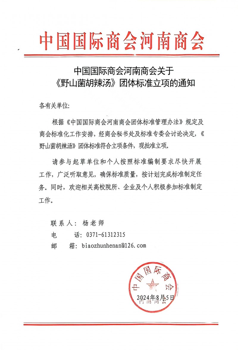 核心提示:中國國際商會河南商會關于《野山菌胡辣湯》團體標準立項的通知