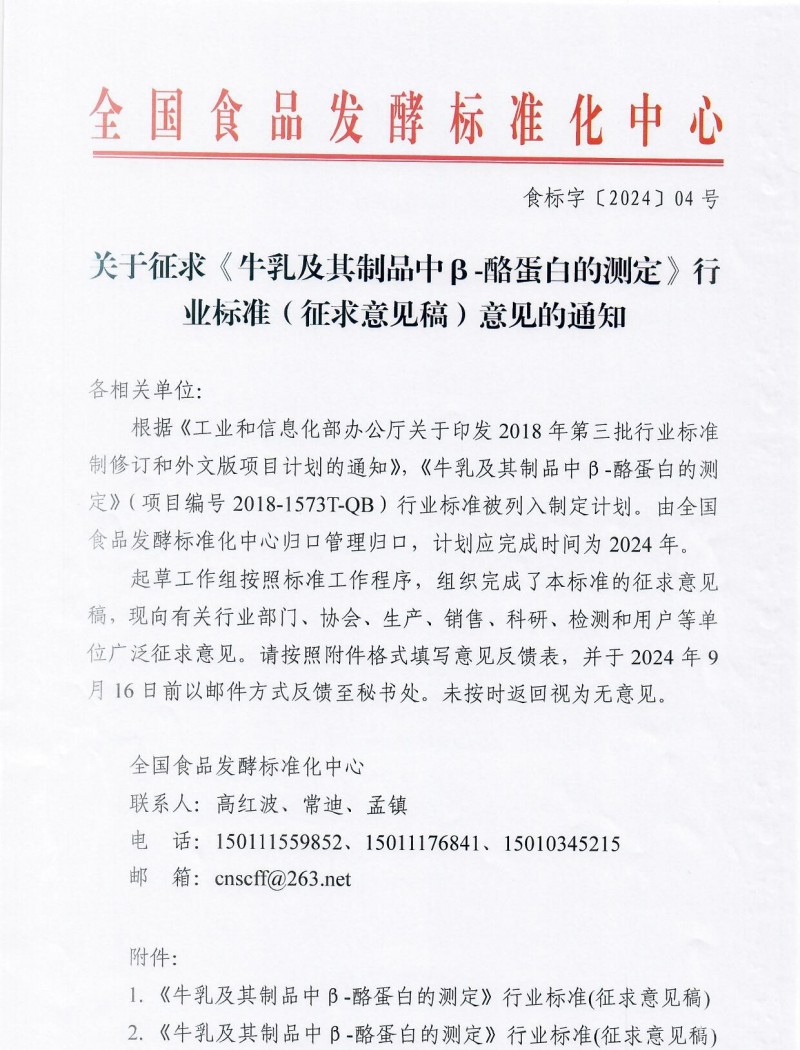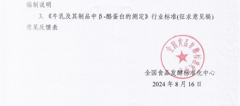全國(guó)食品發(fā)酵標(biāo)準(zhǔn)化中心關(guān)于征求《牛乳及其制品中β-酪蛋白的測(cè)定》行業(yè)標(biāo)準(zhǔn)(征求意見(jiàn)稿)意見(jiàn)的通知