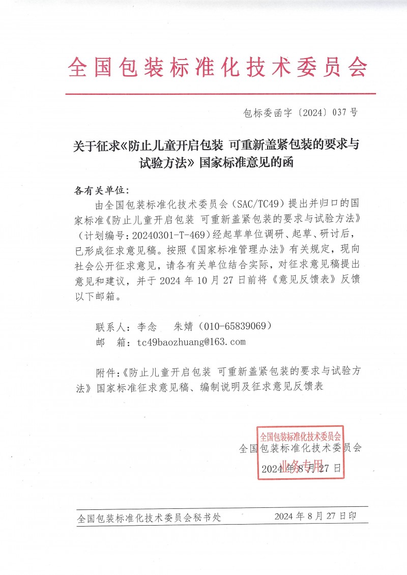 全國包裝標準化技術委員會關于征求《防止兒童開啟包裝 可重新蓋緊包裝的要求與試驗方法》國家標準意見的函(包標委函字[2024]037號)