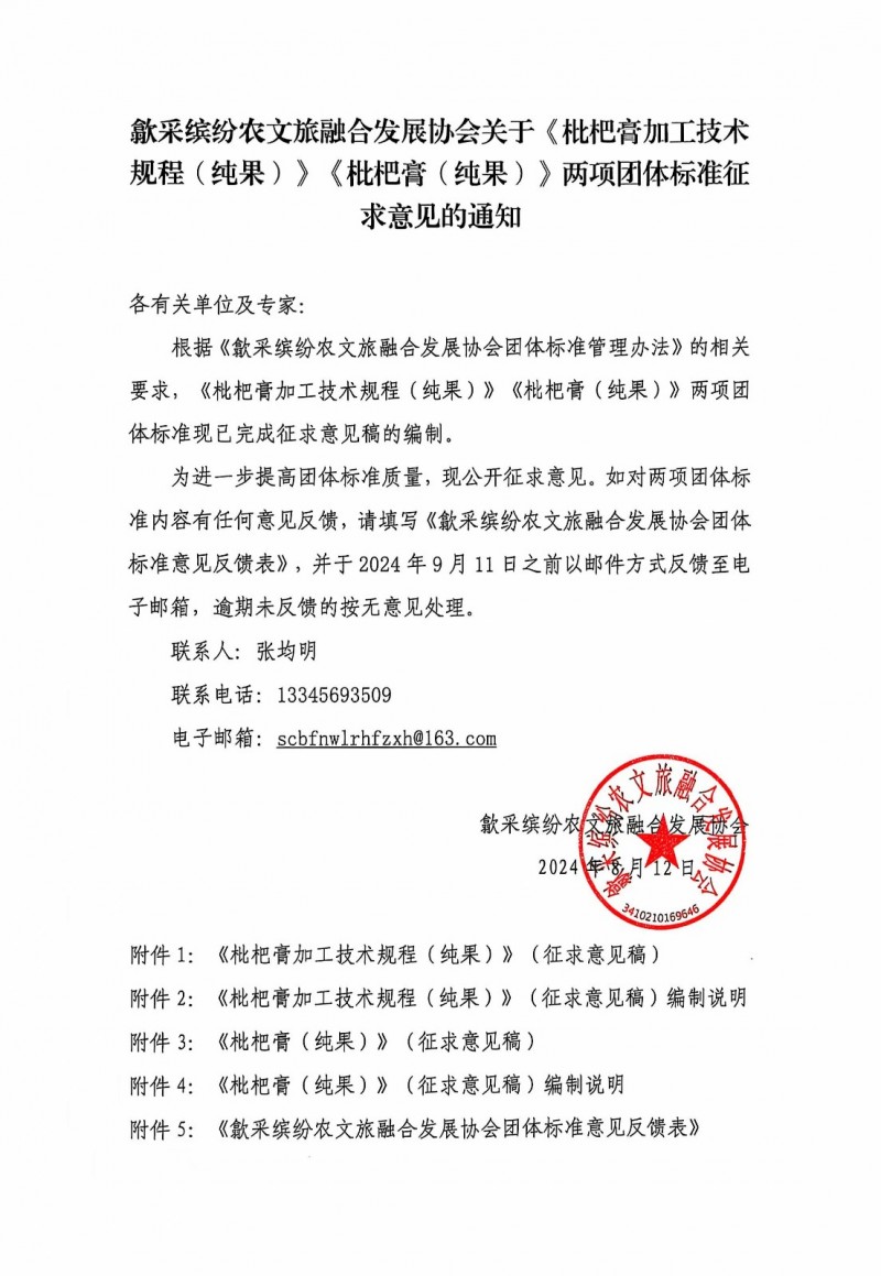 歙采繽紛農文旅融合發展協會關于《枇杷膏加工技術規程(純果)》《枇杷膏(純果)》兩項團體標準征求意見的通知