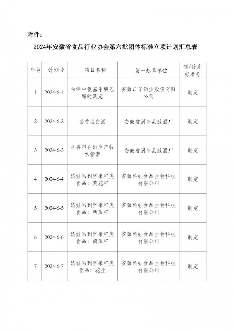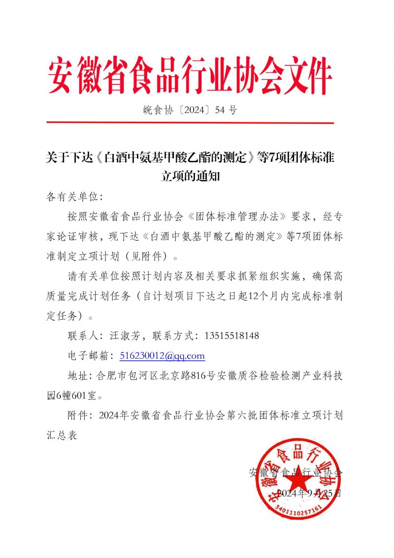 安徽省食品行業協會關于下達《白酒中氨基甲酸乙酯的測定》等7項團體標準立項的通知(皖食協〔2024〕54號)