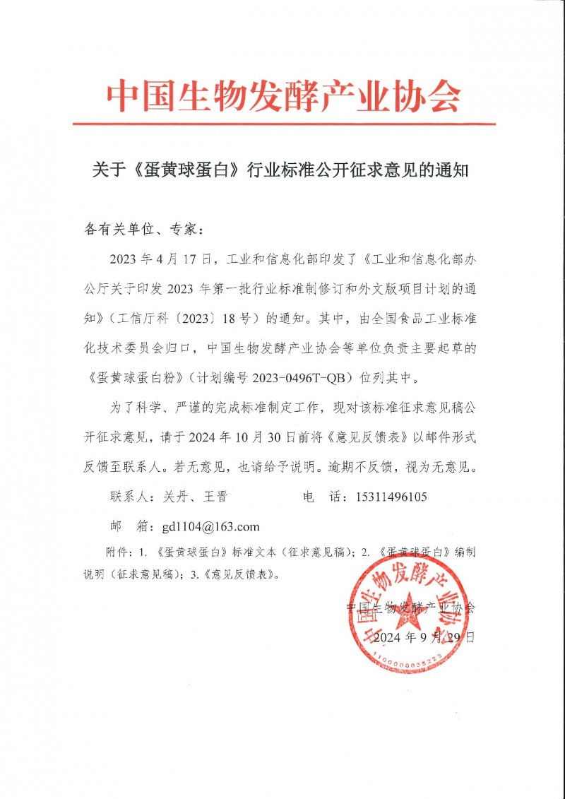 中國(guó)生物發(fā)酵產(chǎn)業(yè)協(xié)會(huì)關(guān)于《蛋黃球蛋白》行業(yè)標(biāo)準(zhǔn)公開(kāi)征求意見(jiàn)的通知