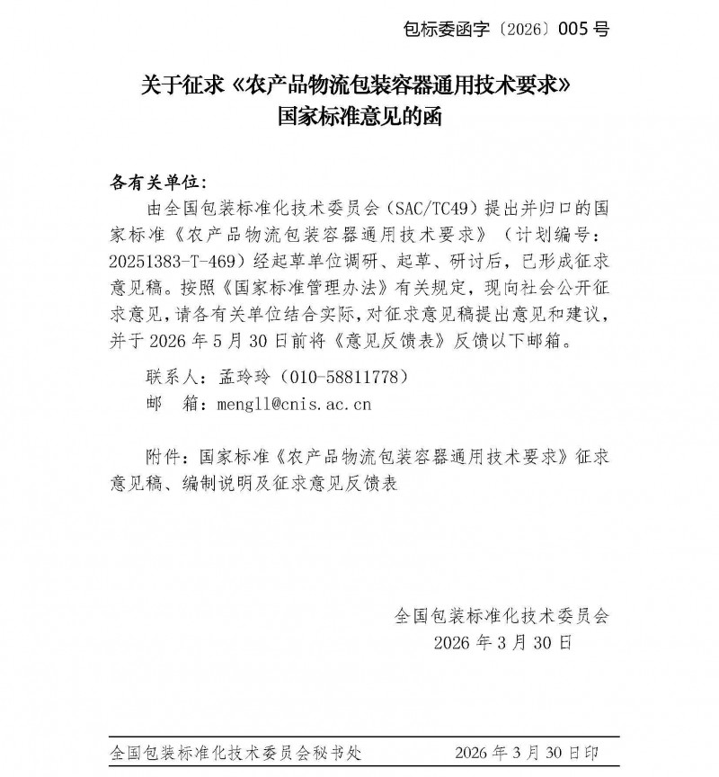 全國包裝標準化技術委員會關于征求《農產品物流包裝容器通用技術要求》國家標準意見的函(包標委函字〔2026〕005 號)