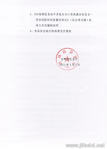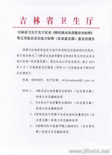 根據《吉林省食品安全地方標準制定實施細則》的規定,我廳組織制定了《鮮活淡水魚質量安全標準》等五項食品安全地方標準(征求意見稿),F向社會公開征求意見,請于2013年4月7日前將意見反饋表(附件6)以傳真或電子郵件形式反饋我廳。