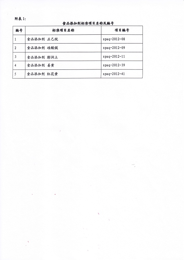 食品添加劑正己炕等5項標準被列入2012年食品安全國家標準制(修)訂計劃項目(項目名稱及編號見附表1),根據衛生部食品安全綜合協調與衛生監督局“食品安全國家標準制(修)訂項目委托協議書(2012年)”,中菌食品發酵工業研究院和中國食品添加劑和配料協會作為此批項目承擔單位,負責組織該批標準的制(修)訂工作。