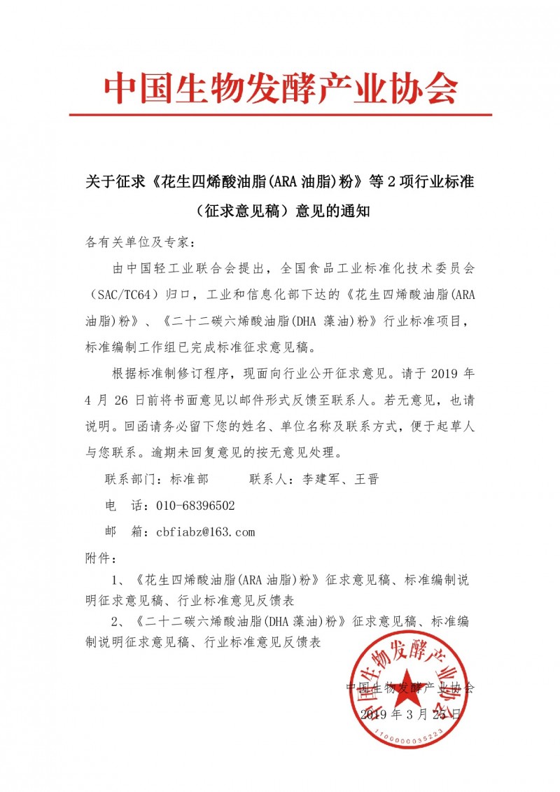 (SAC/TC64)歸口,工業和信息化部下達的《花生四烯酸油脂(ARA油脂)粉》、《二十二碳六烯酸油脂(DHA 藻油)粉》行業標準項目,標準編制工作組已完成標準征求意見稿。